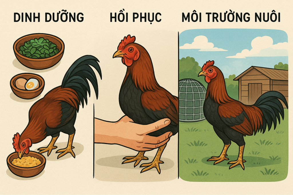 - Giảm cường độ luyện tập để tránh gà bị hao hụt sức khỏe.